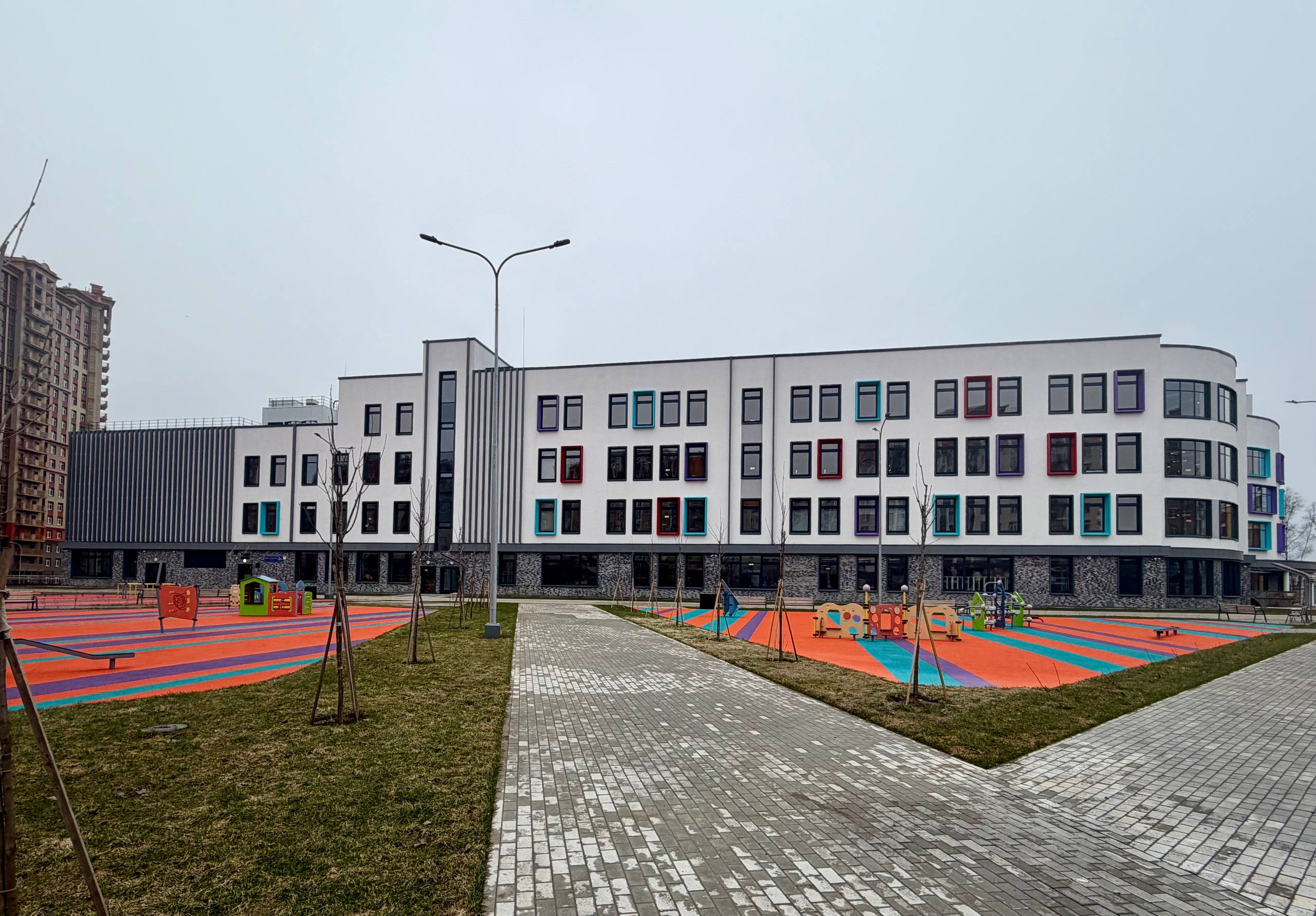 На прилегающей территории обустроили физкультурные и игровые площадки. Также оборудовали стадион с футбольным полем, площадками для баскетбола и волейбола, беговыми дорожками и трибунами.