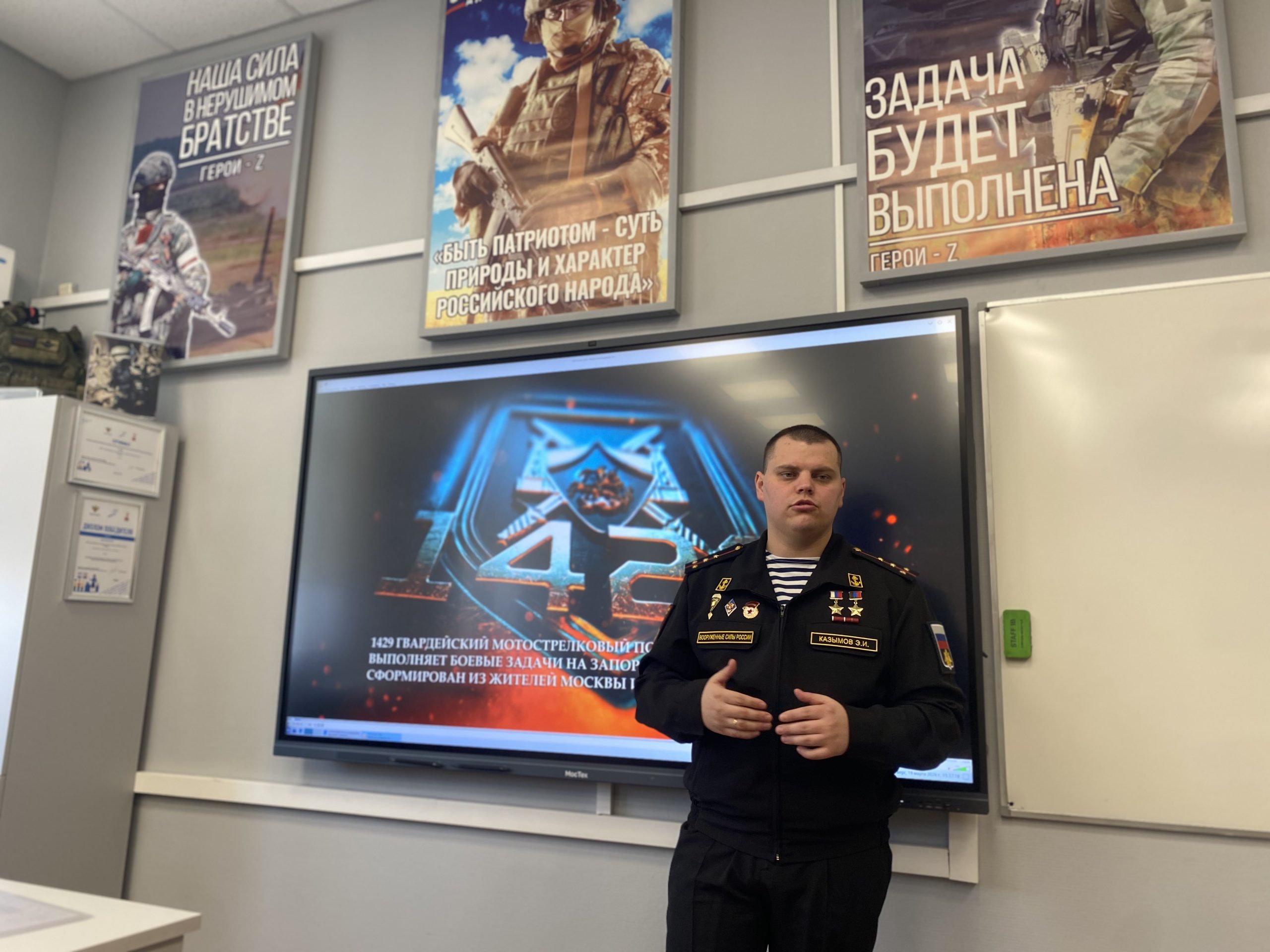 В музее специальной военной операции (СВО) школы № 1517 в районе Хорошево-Мневники состоялась встреча кадетов с Героем России, участником СВО, сторонником партии «Единая Россия» Эдуардом Казымовым.