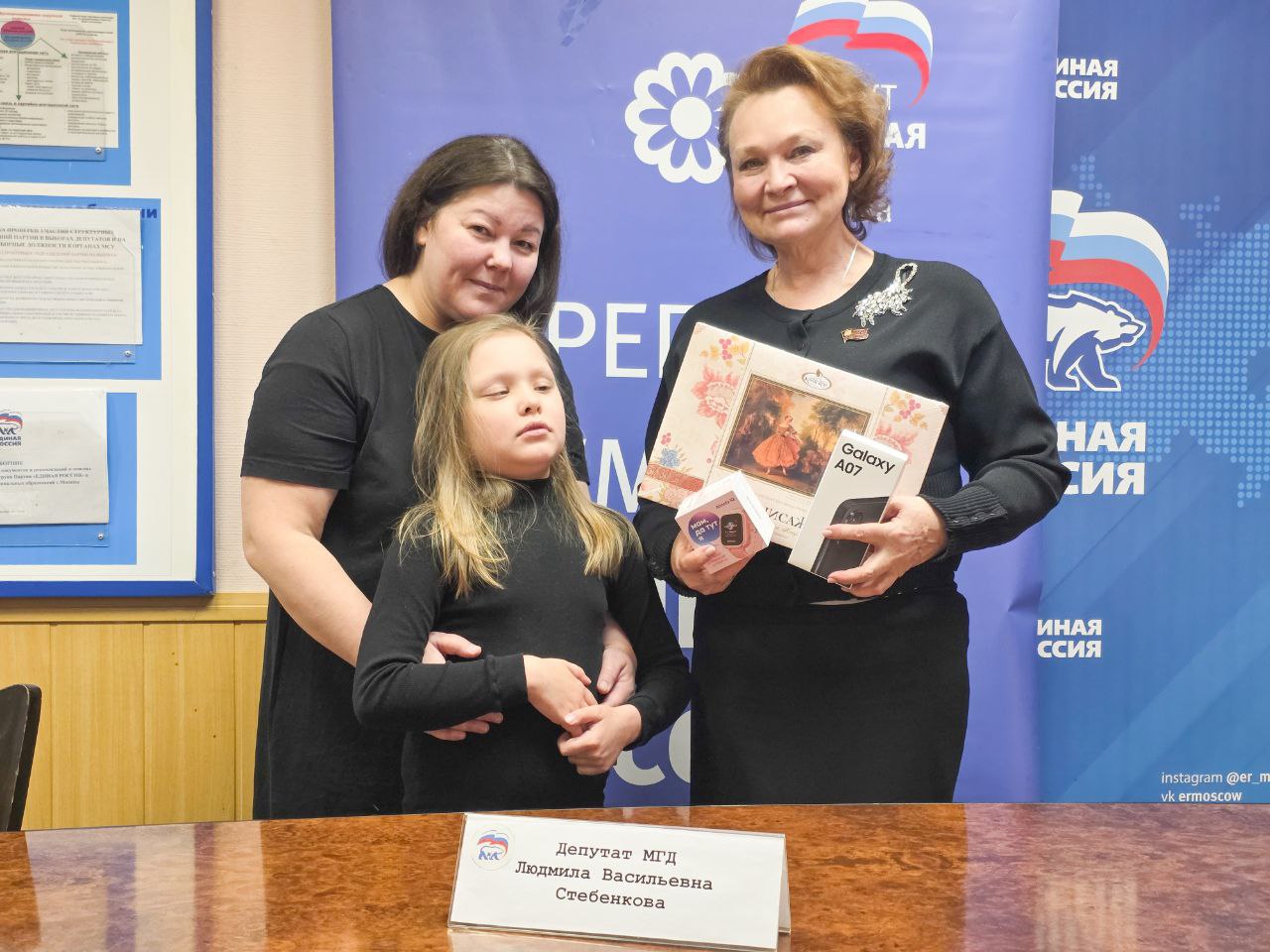 «С огромным удовольствием вручила Марусе телефон, часы и, конечно, шоколадные конфеты. От всей души пожелала ей огромных успехов в учебе и во всех начинаниях, которые она планирует осуществить в будущем», — поделилась Людмила Стебенкова.