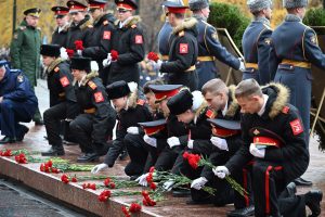 Военнослужащие Преображенского полка вынесли два венка из еловых ветвей, украшенные лентами, белыми и красными гвоздиками. Собравшиеся почтили память павших в Великой Отечественной войне минутой молчания.