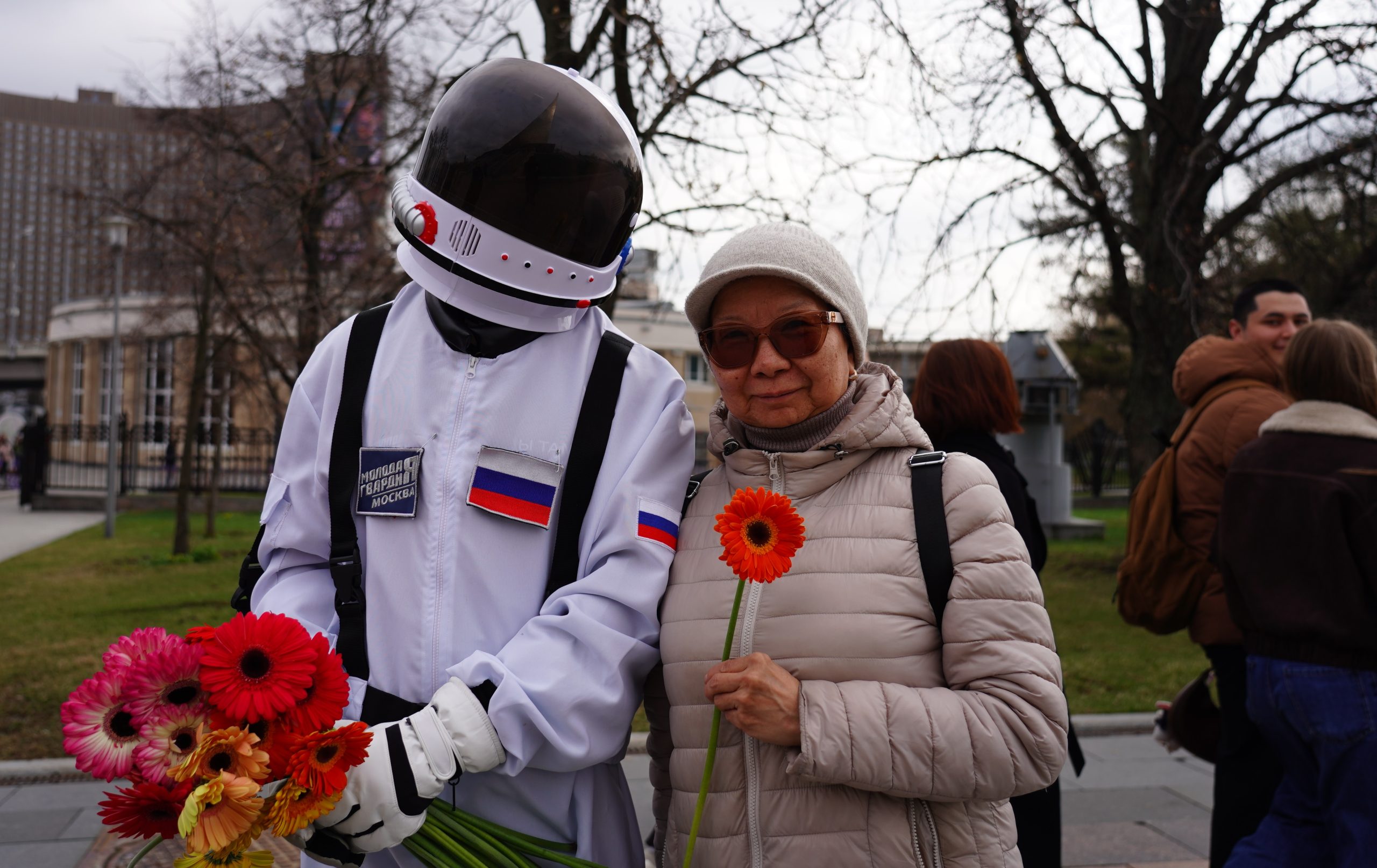 В рамках акции молодогвардеец в костюме космонавта поздравлял москвичек и вручал им герберы. Эти цветы относятся к семейству астровых и нередко ассоциируются с космической тематикой, что сделало их символичным подарком в праздничный день.