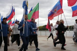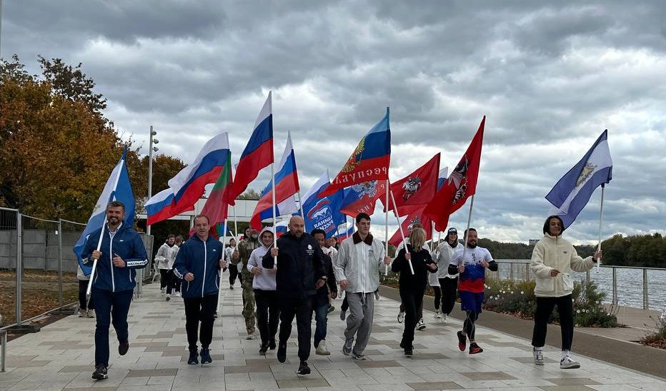 Участники забега с флагами России, Москвы и воссоединенных регионов отметили годовщину возвращения Луганской и Донецкой Народных Республик, Херсонской и Запорожской областей в состав страны.