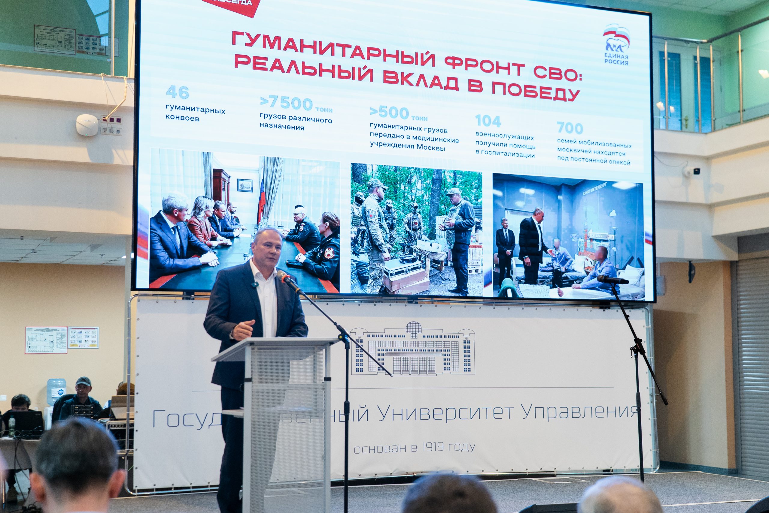Открывая встречу, Петр Толстой сделал акцент на работе «гуманитарного фронта». С начала специальной военной операции Московское отделение «Единой России», которое возглавляет Толстой, организовало 46 гуманитарных конвоев. Общий объем доставленных грузов превысил 7,5 тысячи тонн. Из них более 500 тонн было передано непосредственно в медицинские учреждения Москвы, сообщил секретарь столичного отделения «Единой России». Помощь оказывается не только адресно на передовой, но и семьям защитников. Под постоянной опекой находятся у партийцев находятся 700 семей мобилизованных москвичей. Кроме того, 104 военнослужащим оказана помощь в госпитализации.