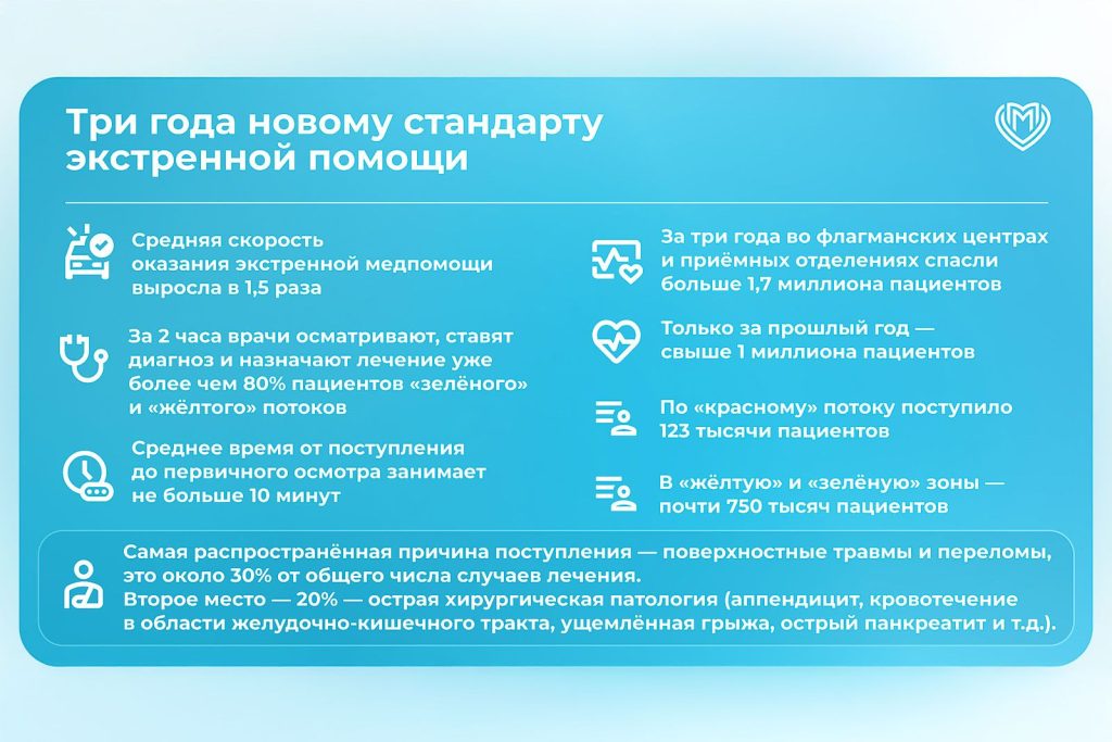 Уже три года московские больницы работают по новому стандарту экстренной помощи. Об этом Сергей Собянин рассказал в своем канале в мессенджере MAX.