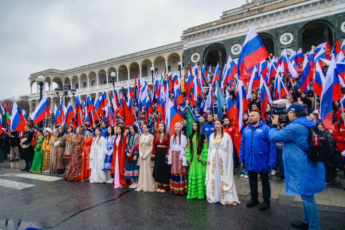 Активисты МГЕР и «Волонтёрской Роты» с флагами России и регионов прошли торжественным шествием по парку Северного Речного вокзала. К мероприятию присоединились представители разных народностей в традиционных костюмах.