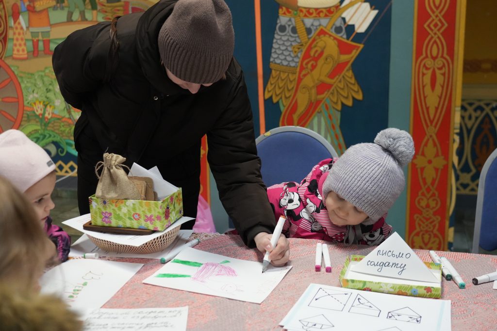 Программа дня также включала в себя тематические выставки, работу полевой кухни и семейные мастер-классы, на которых взрослые и дети создавали памятные сувениры и писали письма для бойцов.