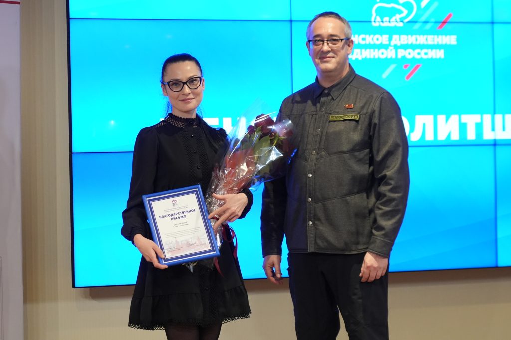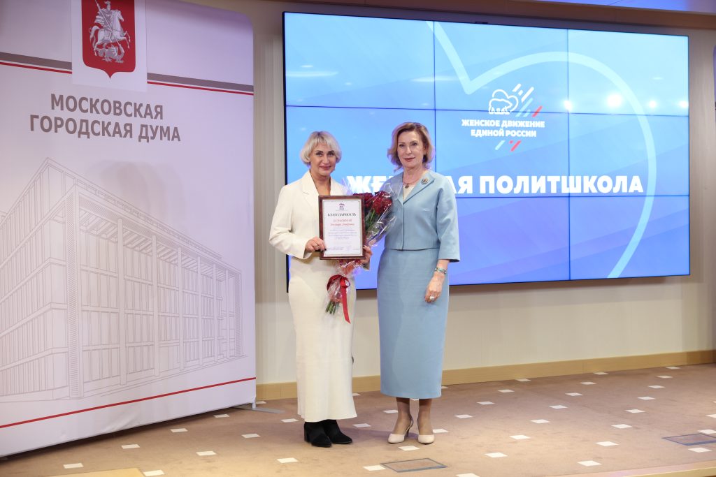 По итогам сессии Инна Святенко и Алексей Шапошников вручили участницам «Женской политшколы» благодарственные письма от секретаря Генерального совета партии Владимира Якушева и заместителя Председателя Государственной Думы, секретаря Московского городского регионального отделения партии «Единая Россия» Петра Толстого.