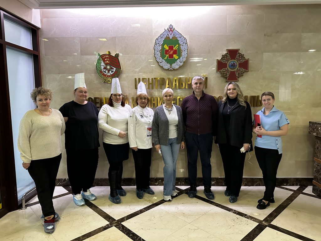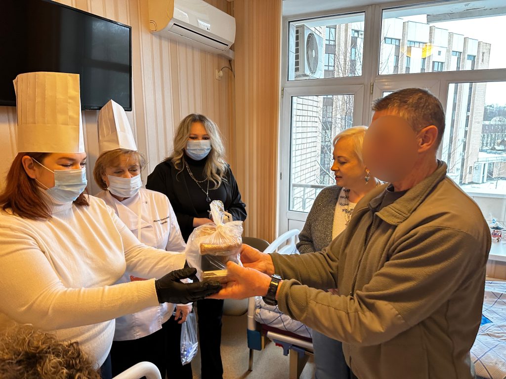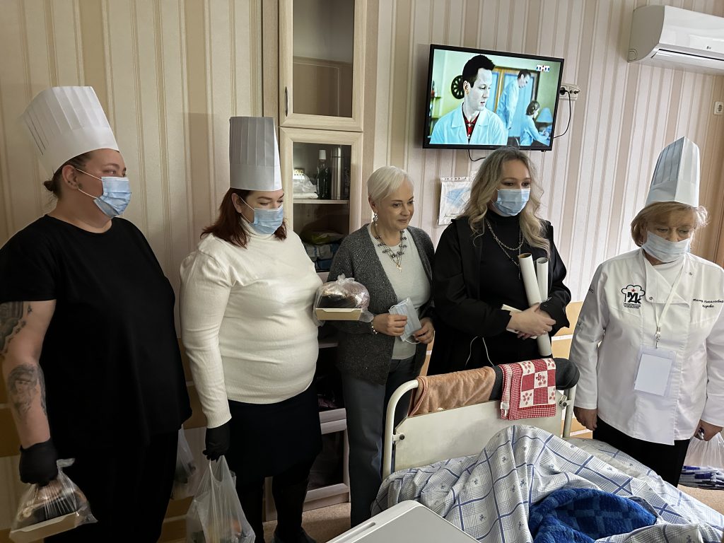 Навестить раненых участников СВО в госпитале имени П.В. Мандрыка вместе с исполнительным секретарем «Единой России» Восточного округа Еленой Хаустовой приехала команда Московской ассоциации кулинаров: президент ассоциации Тамара Шарова, бренд-шеф и технолог ресторана «Пират Пицца» Анастасия Данилова и Татьяна Конюк, а также коллектив культурно-развлекательного комплекса «Кремль в Измайлово» Татьяна Федорова и Сергей Денисов.